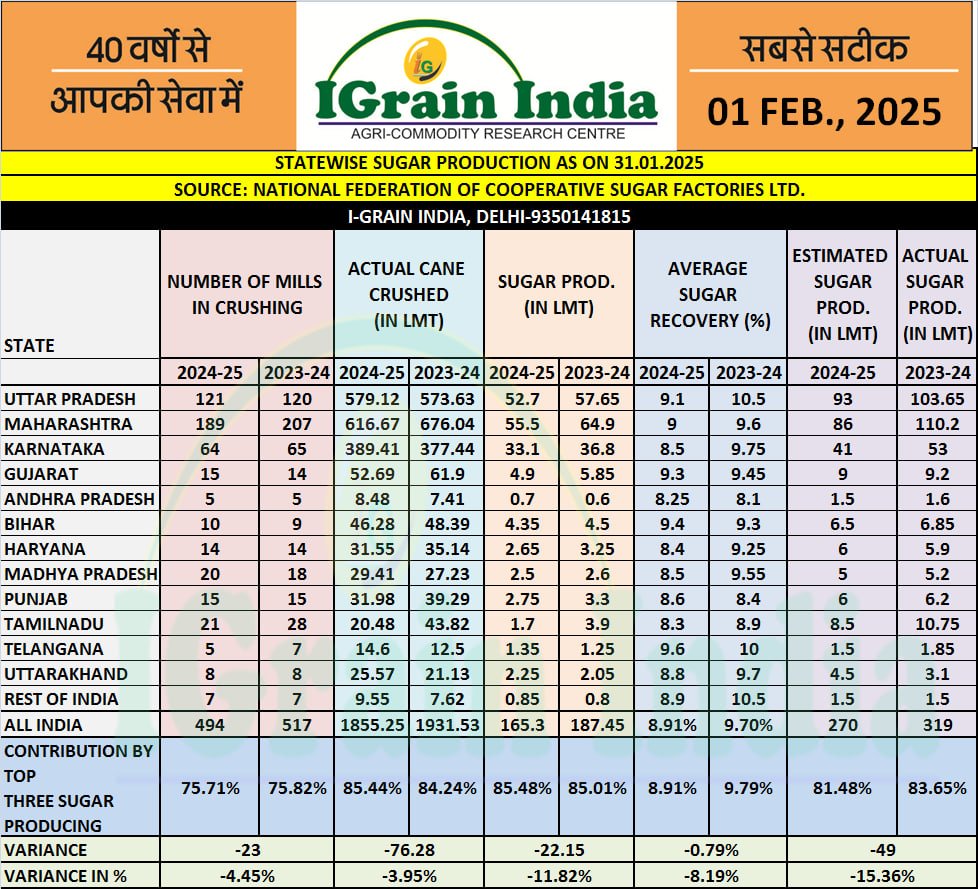 STATEWISE SUGAR PRODUCTION AS ON 31.01.2025