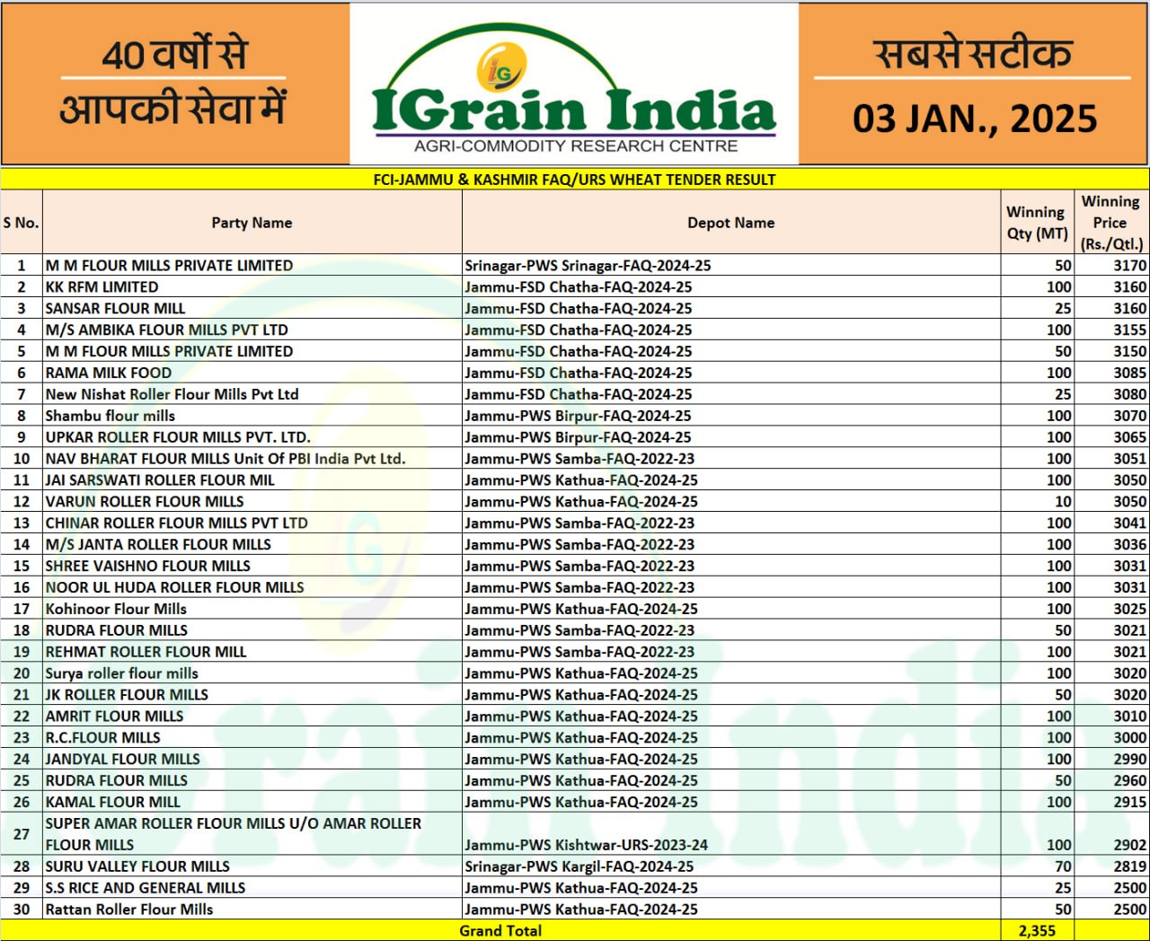 JAMMU KASHMIR FCI WHEAT TENDER RESULT 01-01-2025