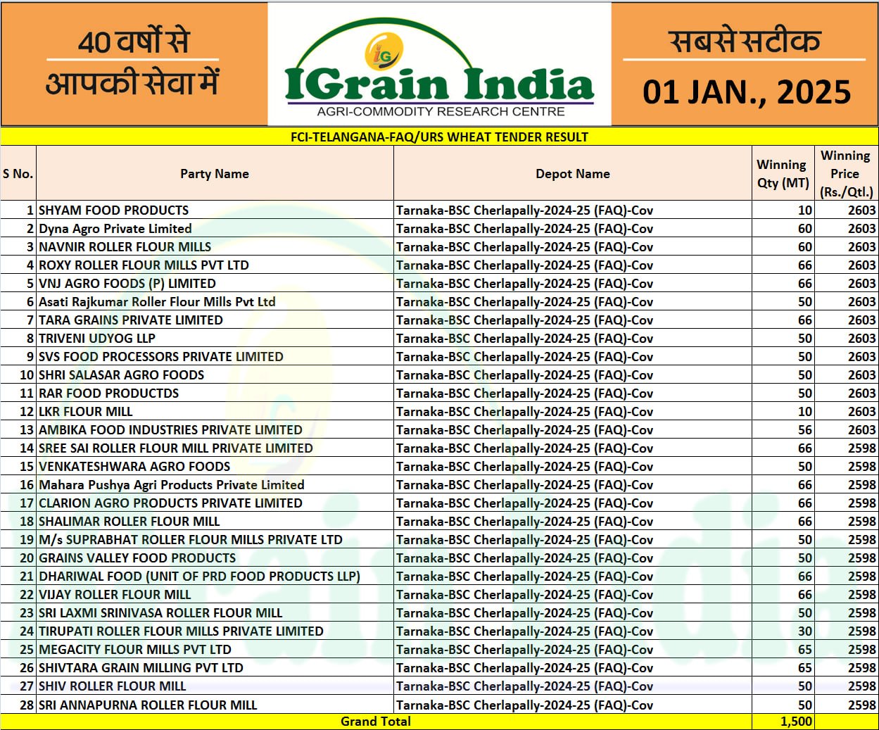 TELANGANA FCI WHEAT TENDER RESULT 01-01-2025