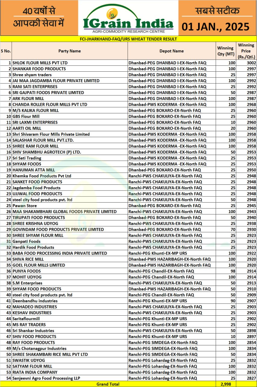 JHARKHAND FCI WHEAT TENDER RESULT 01-01-2025
