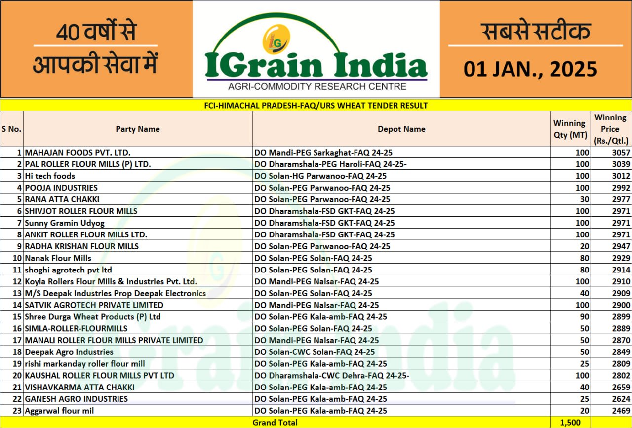 HIMACHAL PRADESH FCI WHEAT TENDER RESULT 01-01-2025