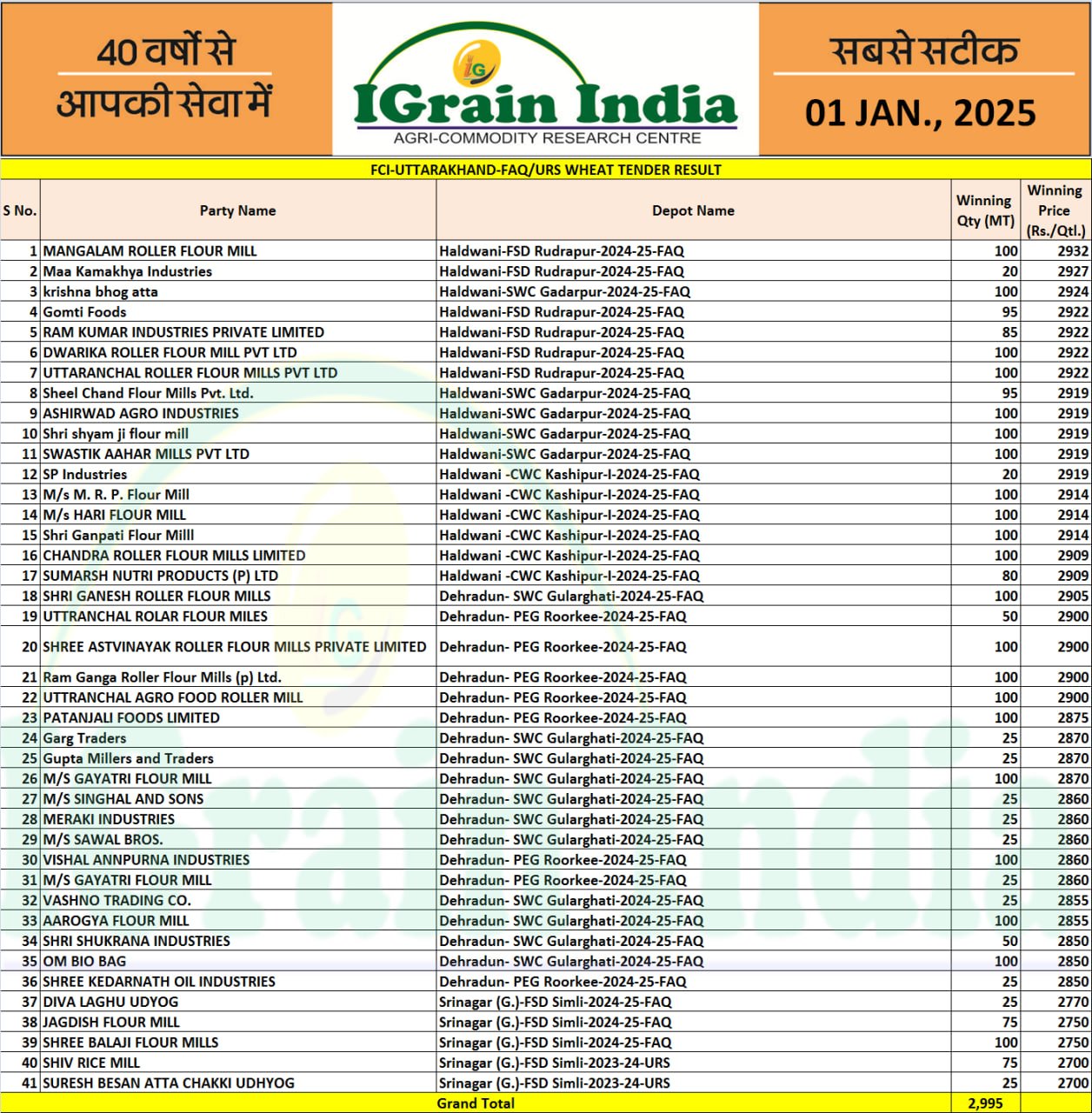 UTTARAKHAND FCI WHEAT TENDER RESULT 01-01-2025