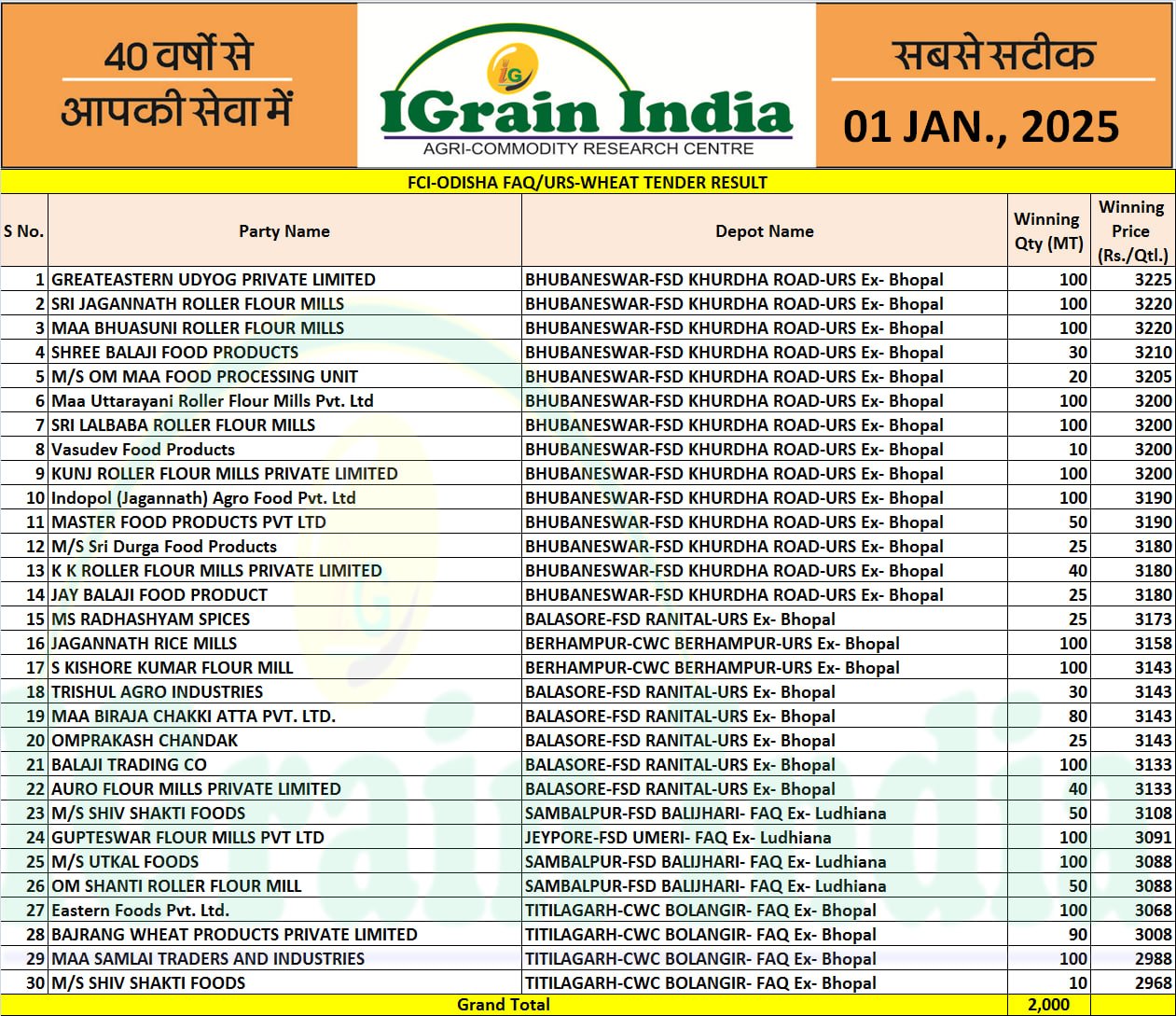 ODISHA FCI WHEAT TENDER RESULT 01-01-2025