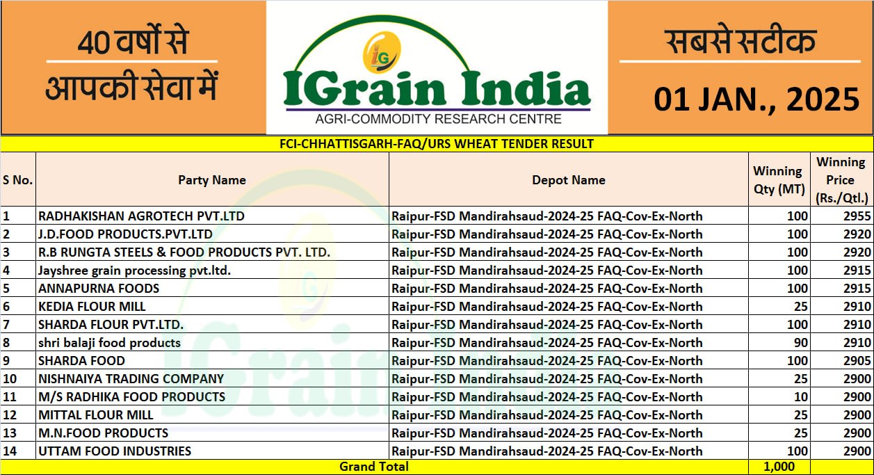 CHHATTISGARH FCI WHEAT TENDER RESULT 01-01-2025