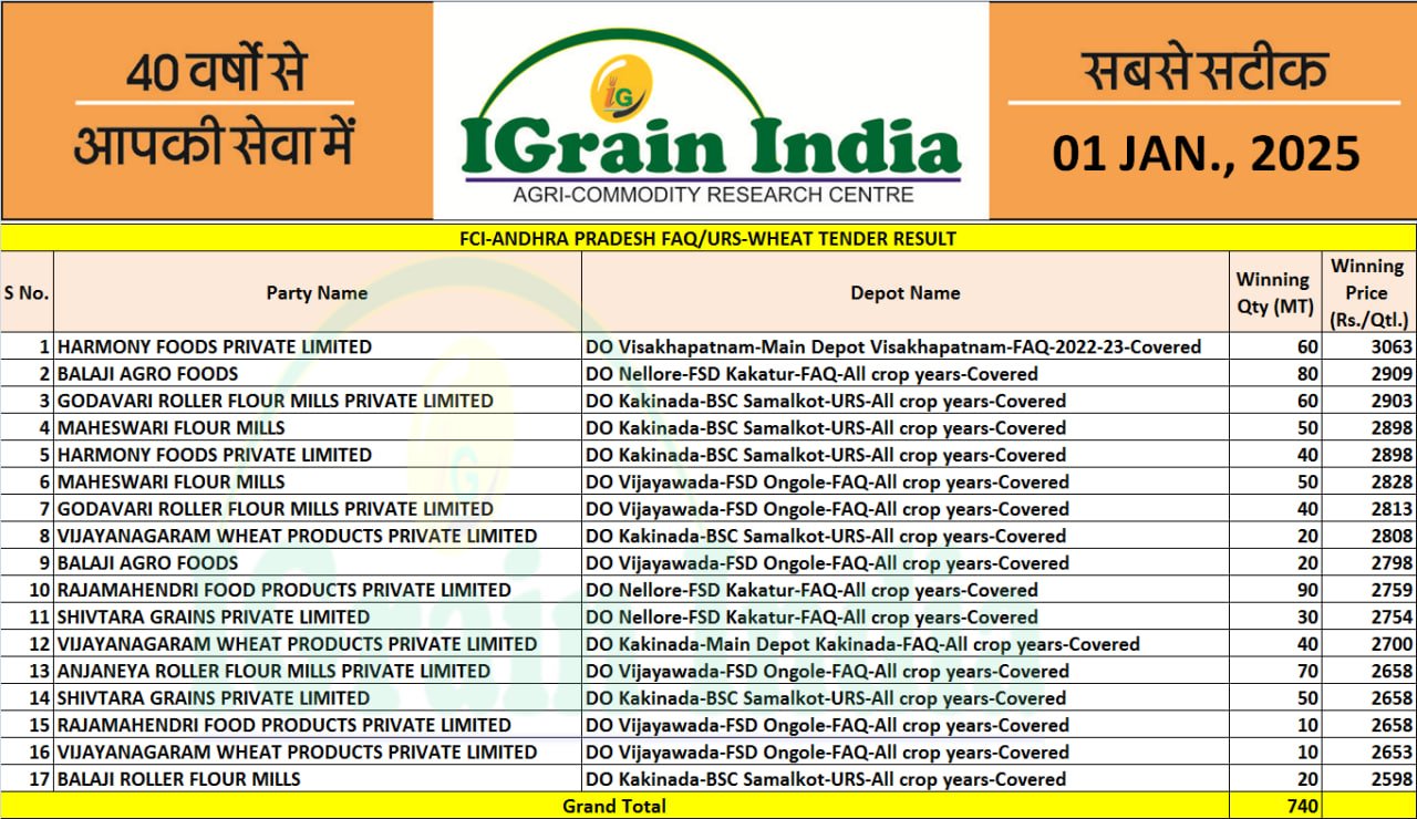 ANDHRA PRADESH FCI WHEAT TENDER RESULT 01-01-2025