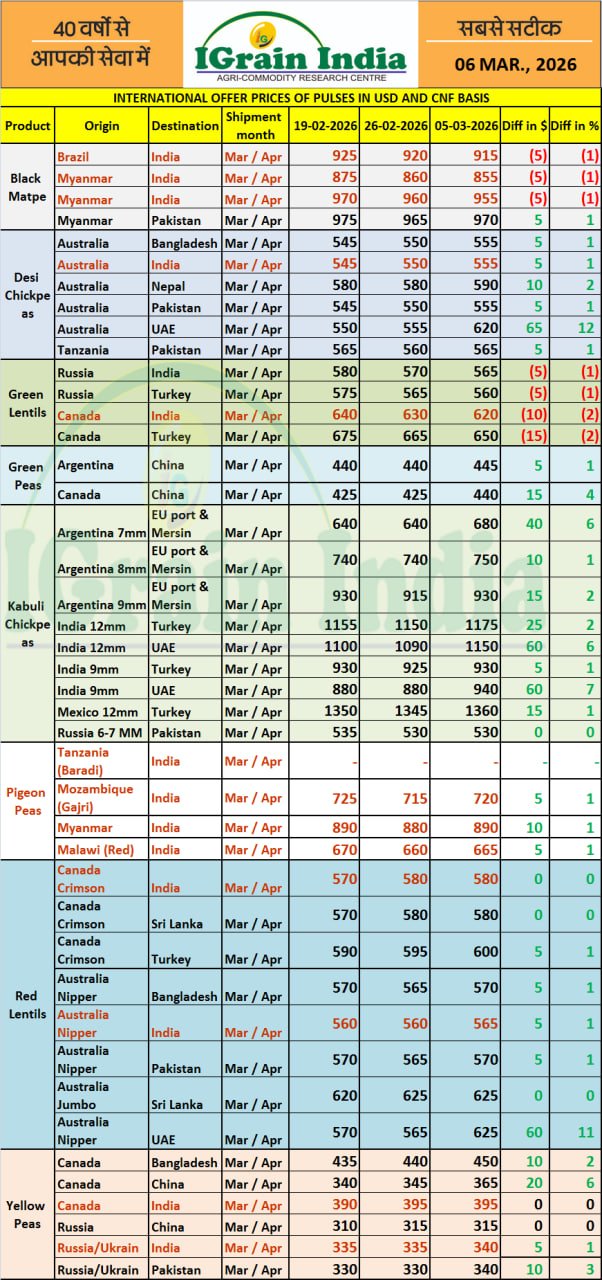 INTERNATIONAL OFFER PRICES OF PULSES IN USD AND CNF BASIS