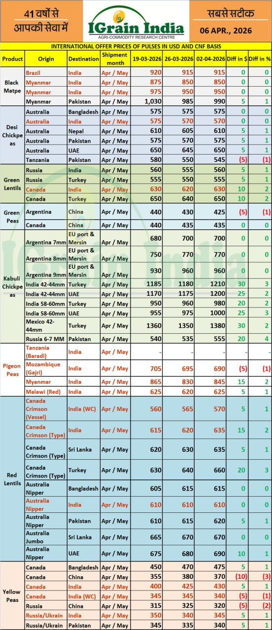 INTERNATIONAL OFFER PRICES OF PULSES IN USD AND CNF BASIS