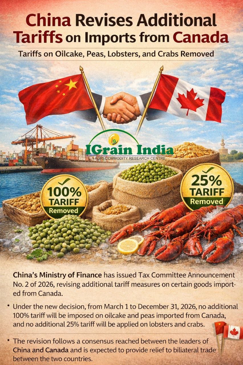नए निर्णय के अनुसार 1 मार्च से 31 दिसंबर 2026 तक कनाडा से आयातित ऑयलकेक और मटर पर 100% अतिरिक्त शुल्क तथा लॉबस्टर और केकड़े पर 25% अतिरिक्त शुल्क नहीं लगाया जाएगा।