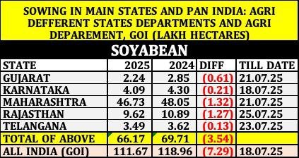 ★ According to data from the Ministry of Agriculture (Government of India) and various state agriculture departments, soybean sowing across the country reached 111.67 lakh hectares as of July 18, 2025. This is down from 118.96 lakh hectares during the same period last year – a decline of 7.29 lakh hectares.