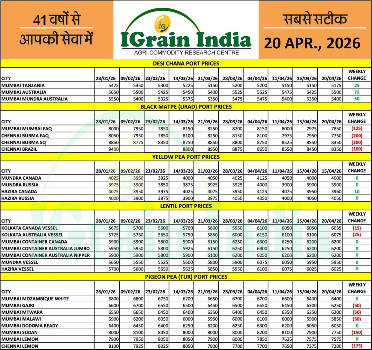 ऑस्ट्रेलिया में चना का निर्यात ऑफर मूल्य लगभग स्थिर