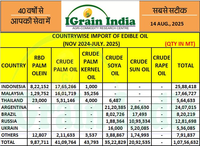 नवम्बर-जुलाई में 107.57 लाख टन खाद्य तेल का आयात