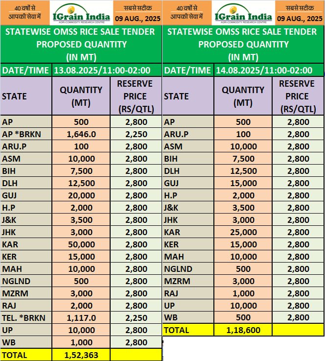 STATEWISE OMSS RICE SALE TENDER PROPOSED QUANTITY