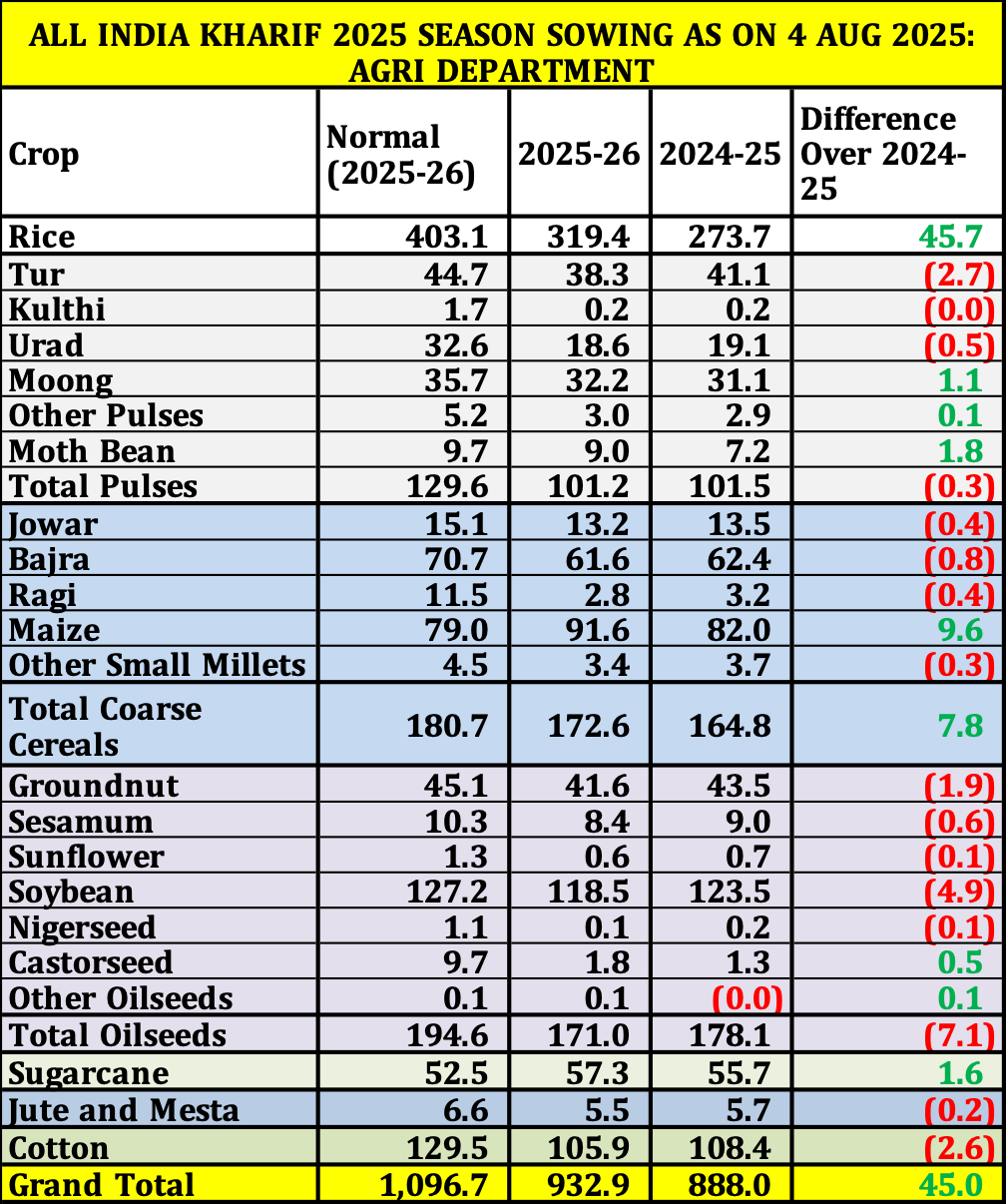 ALL INDIA KHARIF 2025 SEASON SOWING AS ON 4 AUG 2025: AGRI DEPARTMENT