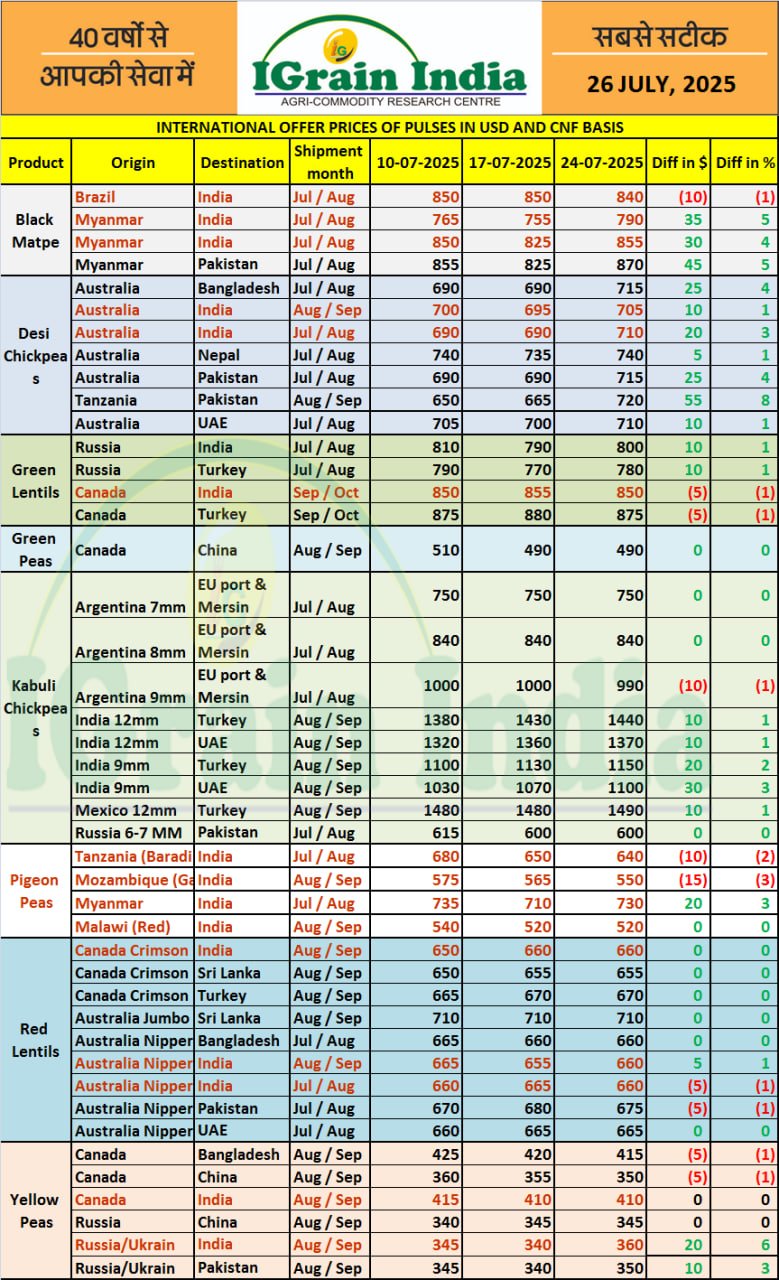 INTERNATIONAL OFFER PRICES OF PULSES IN USD AND CNF BASIS