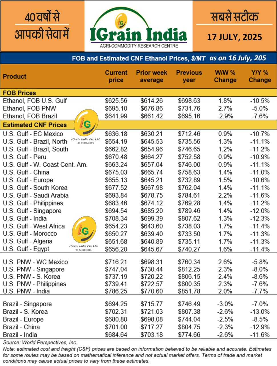 FOB AND ESTIMATED CNF ETHANOL PRICES