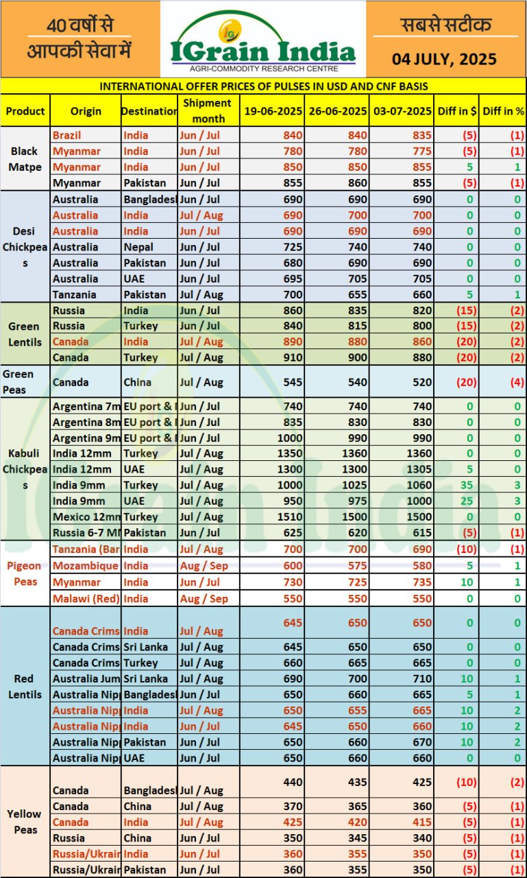 INTERNATIONAL OFFER PRICES OF PULSES IN USD AND CNF BASIS