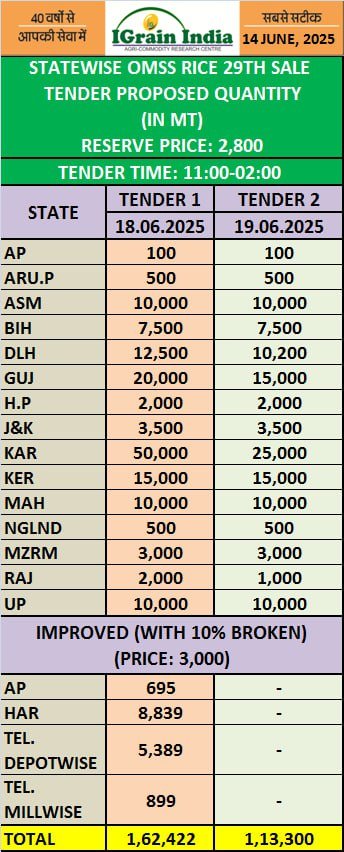 STATEWISE OMSS RICE 29TH SALE TENDER PROPOSED QUANTITY