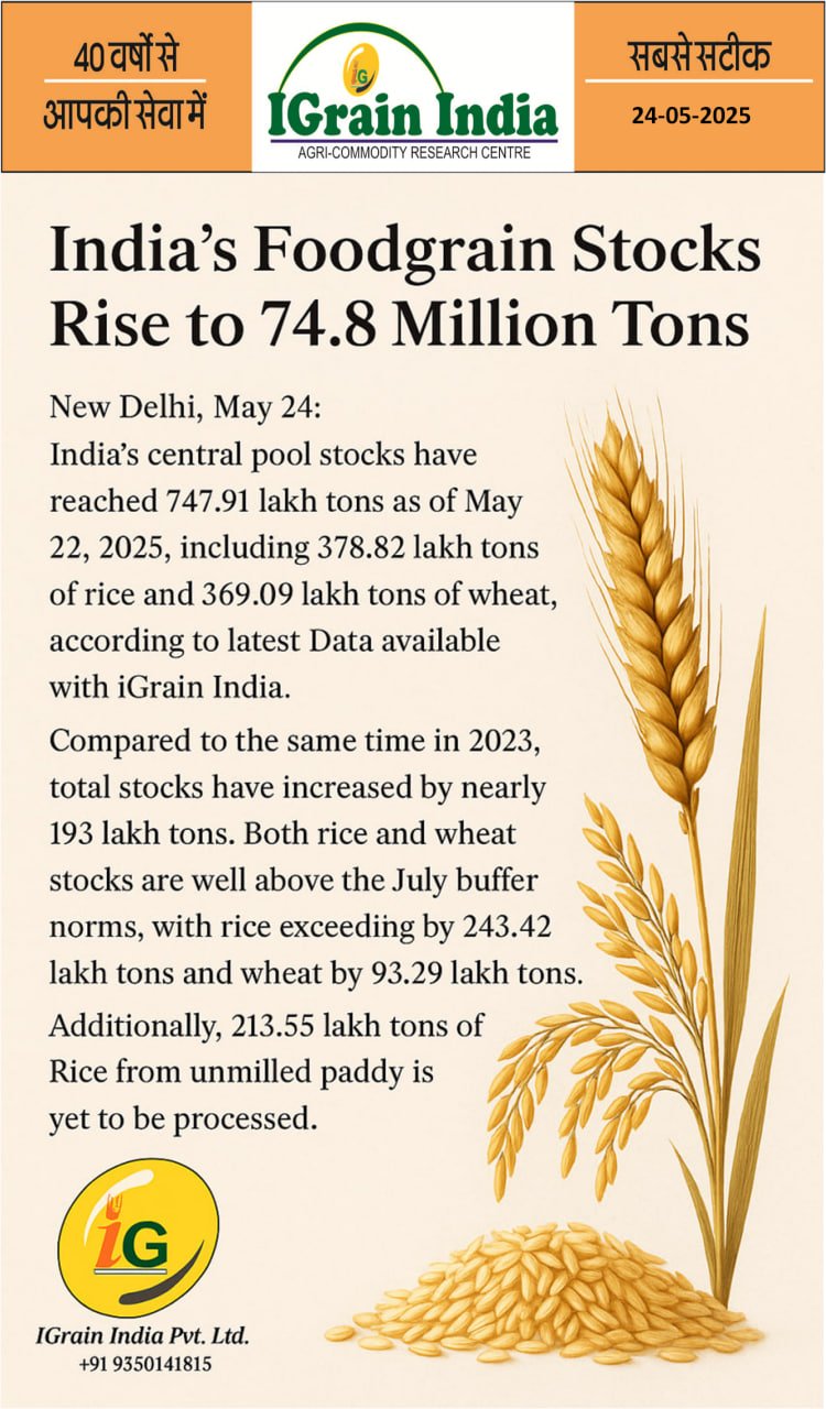 INDIA'S FOODGRAIN STOCKS RISE TO 74.8 MILLION TONS