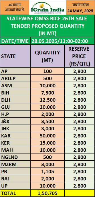 STATEWISE OMSS RICE 26TH SALE TENDER PROPOSED QUANTITY 28.05