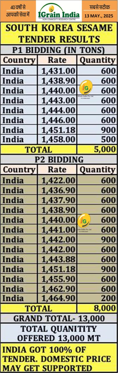 दक्षिण कोरिया तिल टेंडर परिणाम – मई 2025 भारत ने मारी बाज़ी