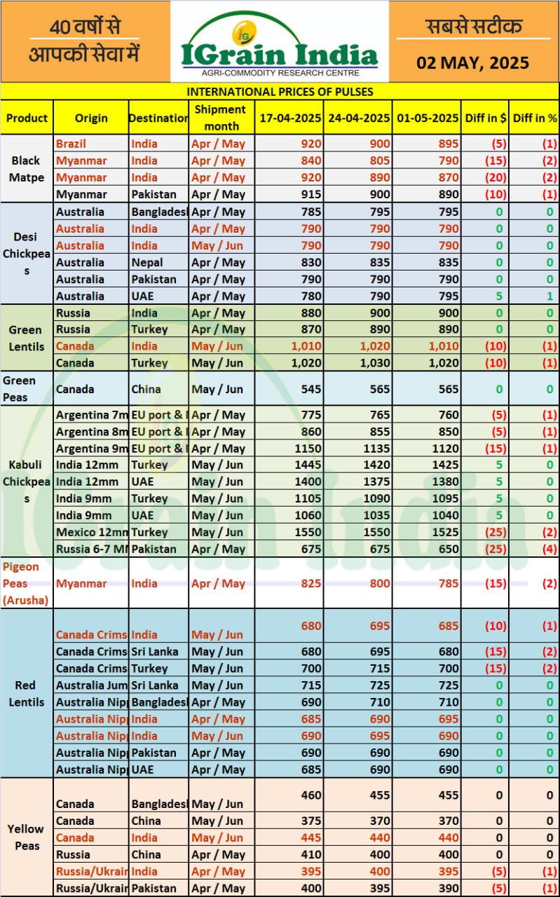 INTERNATIONAL PRICES OF PULSES 01 MAY