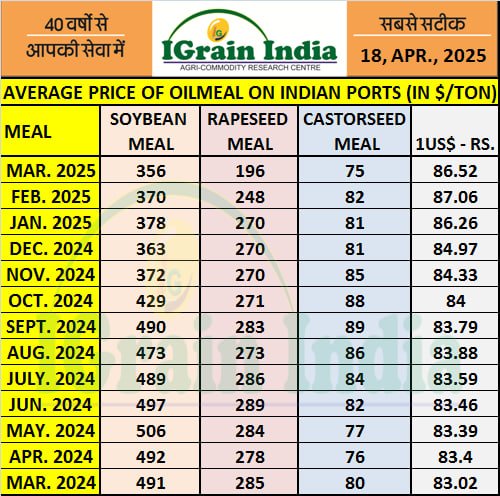 AVERAGE PRICE OF OILMEALS ON INDIAN PORTS MARCH