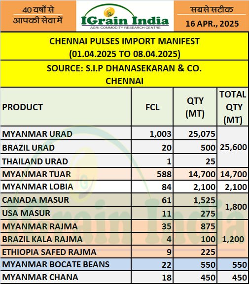 CHENNAI PULSES IMPORT MANIFEST APRIL