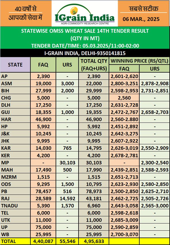 RAJASTHAN FCI OMSS WHEAT TENDER RESULT 05-03-2025