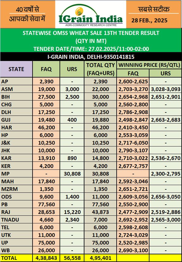 JAMMU KASHMIR FCI OMSS WHEAT TENDER RESULT 27-02-2025