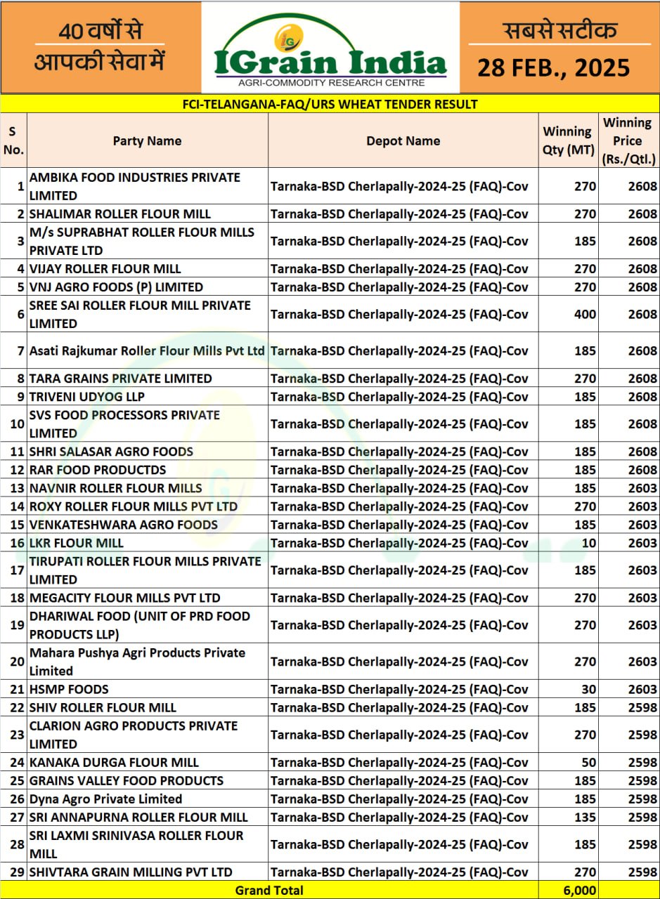 TELANGANA FCI OMSS WHEAT TENDER RESULT 27-02-2025