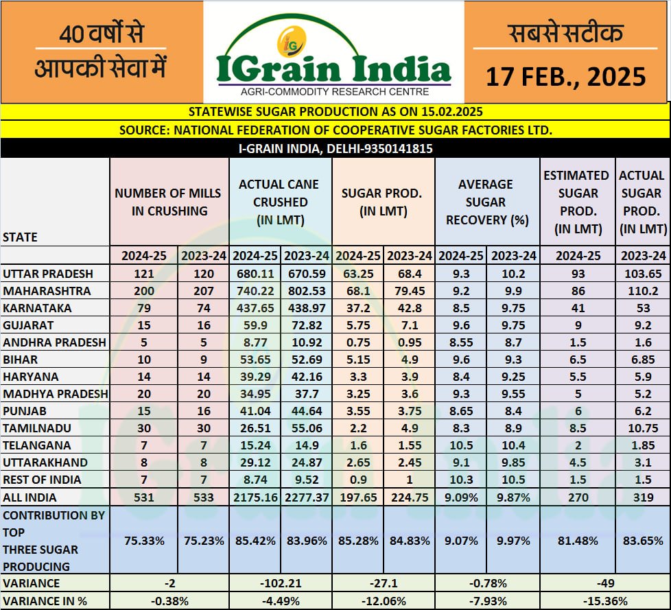 STATEWISE SUGAR PRODUCTION AS ON 15.02.2025