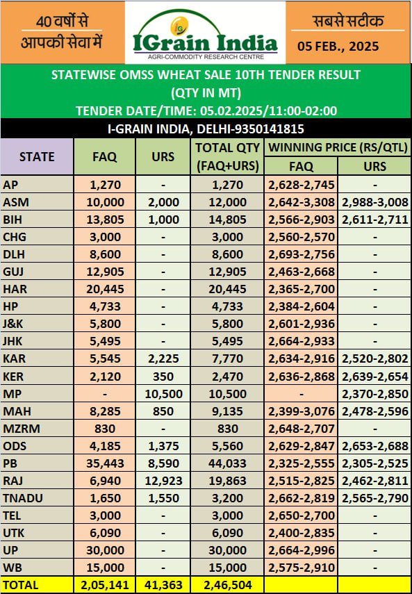 PUNJAB FCI OMSS WHEAT TENDER RESULT 05-02-2025