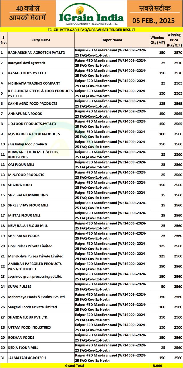 CHHATTISGARH FCI OMSS WHEAT TENDER RESULT 05-02-2025