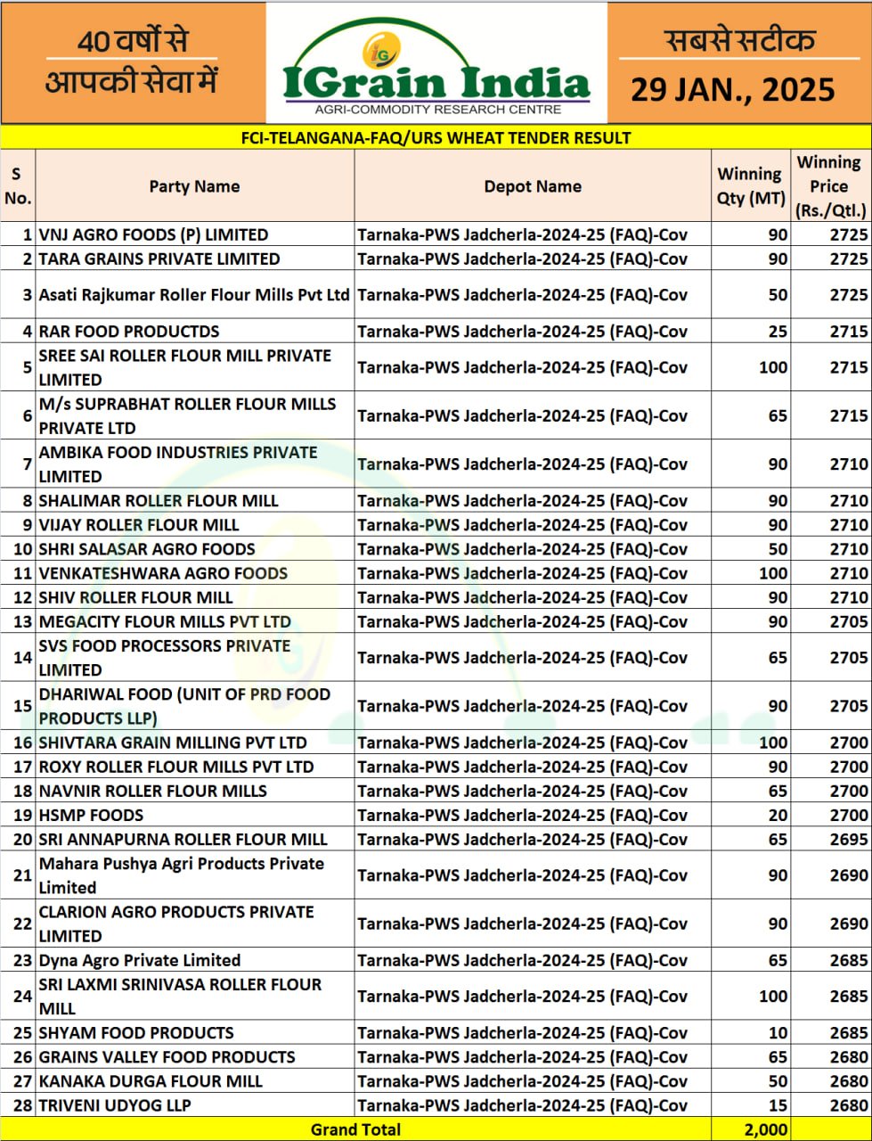 TELANGANA FCI OMSS WHEAT TENDER RESULT 29-01-2025