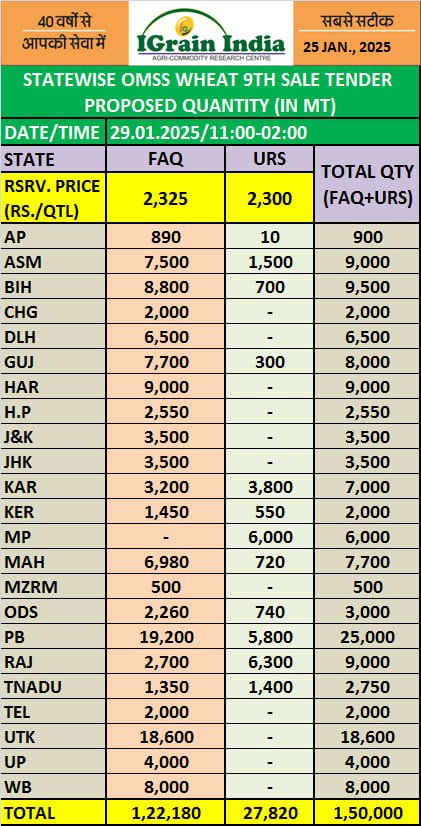 STATEWISE OMSS WHEAT 9TH SALE TENDER