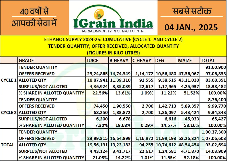 ETHANOL SUPPLY 2024-25: CUMULATIVE TENDER OFFER ALLOCATED QUANTITY