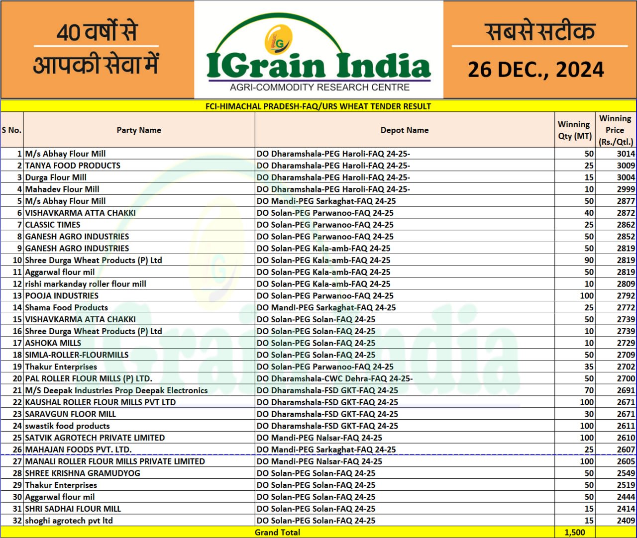 HIMACHAL PRADESH FCI WHEAT TENDER RESULT 26-12-2024