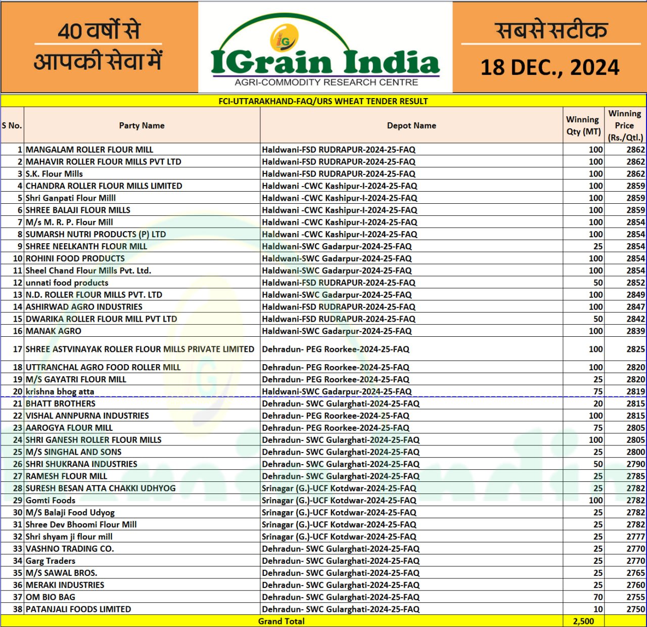 UTTARAKHAND FCI WHEAT TENDER RESULT 26-12-2024