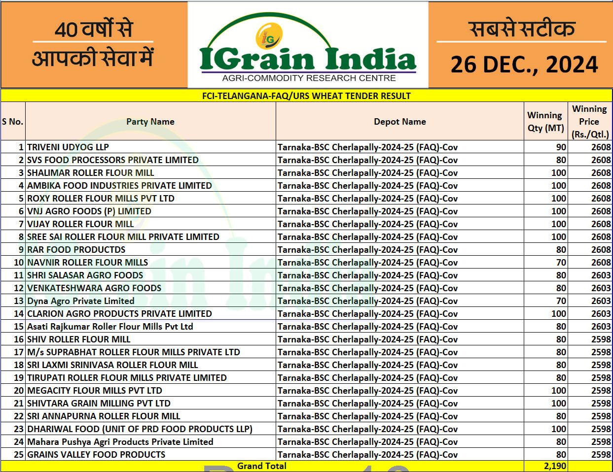 TELANGANA FCI WHEAT TENDER RESULT 26-12-2024