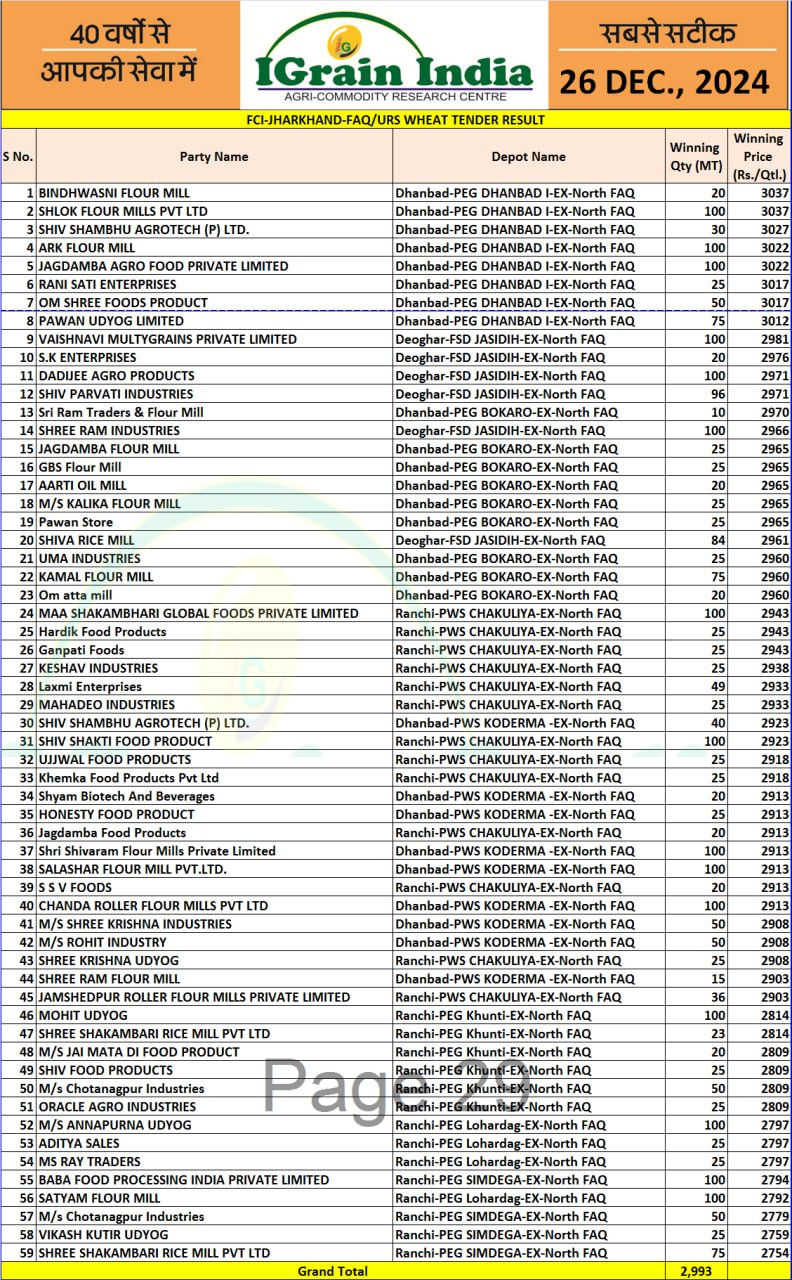JHARKHAND FCI WHEAT TENDER RESULT 26-12-2024