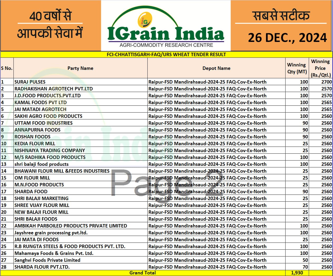 CHHATTISGARH FCI WHEAT TENDER RESULT 26-12-2024