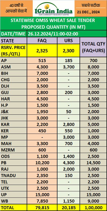 STATEWISE OMSS WHEAT SALE TENDER PROPOSED QUANTITY 21.12.24