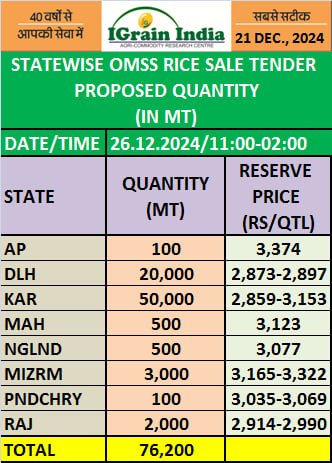 STATEWISE OMSS RICE SALE TENDER 26.12.2024