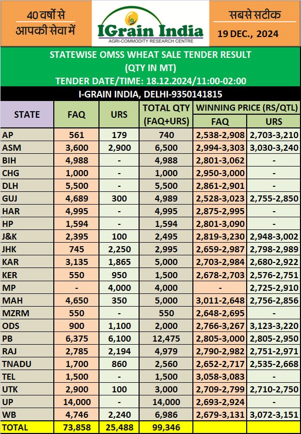 STATEWISE OMSS WHEAT SALE RESULT QUANTITY AND PRICE SHEET