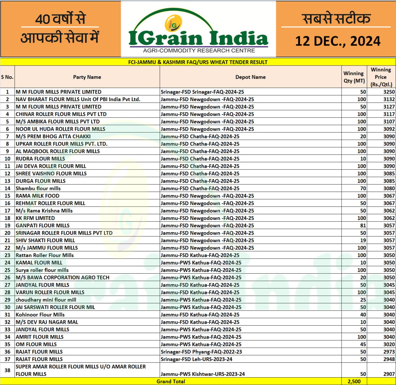 JAMMU & KASHMIR FCI WHEAT TENDER RESULT 11.12.2024