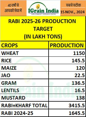 2024-25 सीजन के लिए रबी कालीन खाद्यान्न का उत्पादन लक्ष्य 1645.50 लाख टन नियत