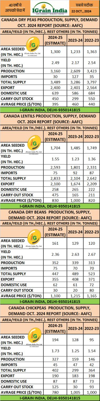 CANADA PULSES PRODUCTION SUPPLY EXPORT DATA BY AAFC