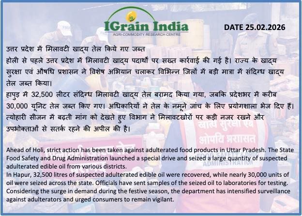 उत्तर प्रदेश में मिलावटी खाद्य तेल किये गए जब्त
