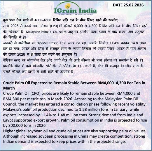 क्रूड पाम तेल मार्च में 4000-4300 रिंगिट प्रति टन के बीच स्थिर रहने की उम्मीद