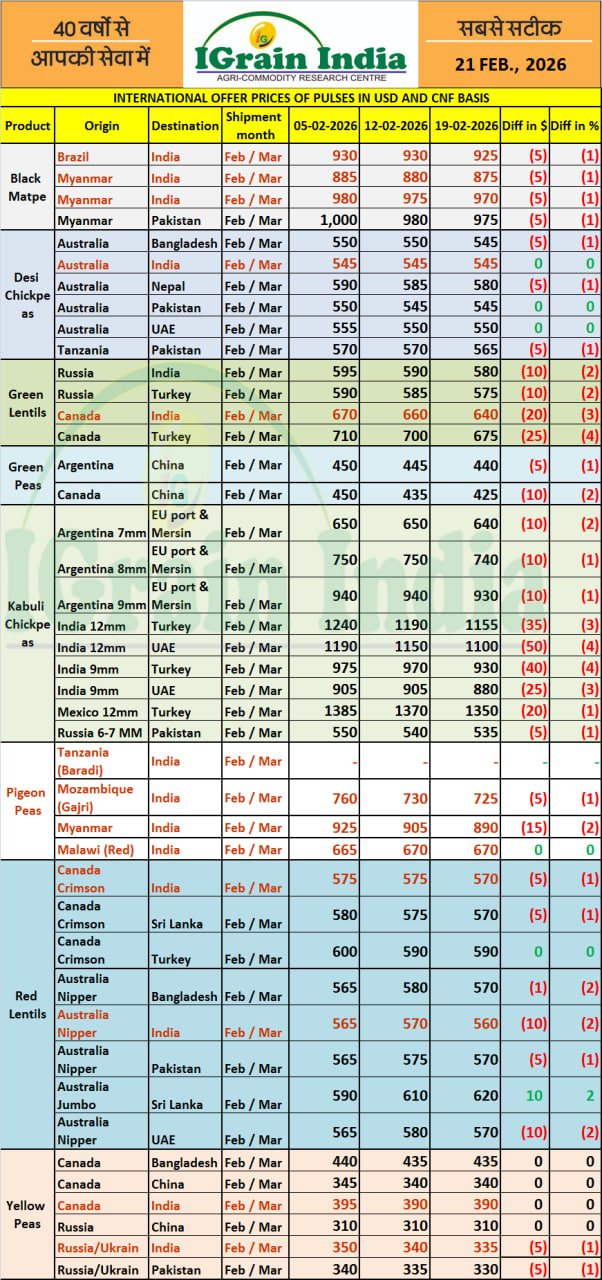 INTERNATIONAL OFFER PRICES OF PULSES IN USD AND CNF BASIS